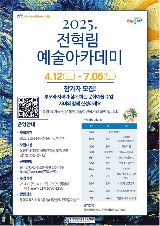 부모-자녀 공동 예술 프로그램 2025. 전혁림예술아카데미를 다음과 같이 운영하니, 희망 학생은 3월 26일 수요일부터, 선착순 접수해 주시기 바랍니다. 가. 일 시: 2025.04.12.(토)~ 7.5.(토) 10시30분~12시30분 매주 토요일 11회 운영 나. 강 사: 통영미술청년작가회 활동 강사 다. 장 소: 통영교육지원청 3층 늘해랑실 및 전혁림미술관 라. 대 상: 통영 관내 초등1학년~초등6학년 및 학부모 25팀(총50명) 마. 접수기간: 2025. 03. 26.(수) ~ 선착순마감 바. 접수방법: 온라인 직접접수 ☞https://naver.me/FTXooYEp 사. 운영내용: 붙임 계획서 참조